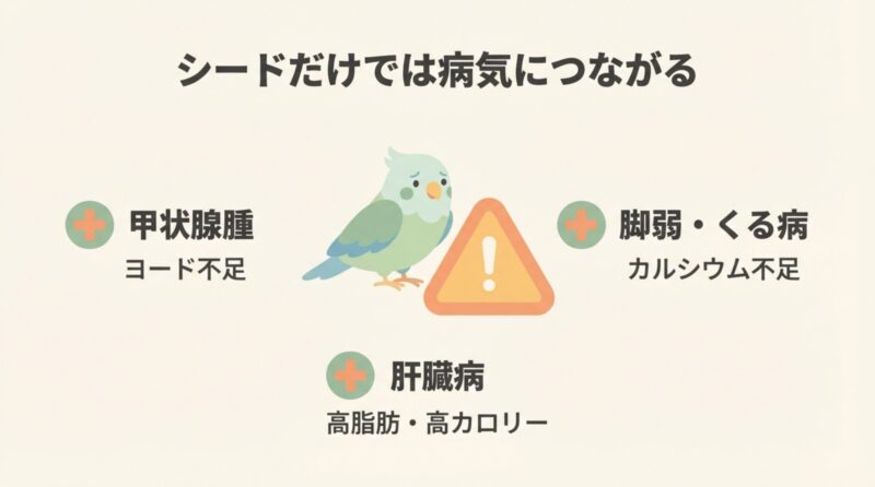 実際に「シードだけ」を与えている鳥には健康トラブルが多く見られます。