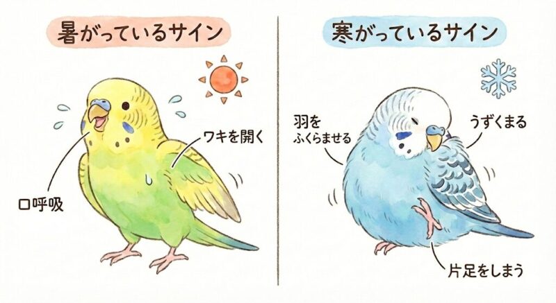 鳥が羽を広げて脇を見せたり、口を開けて苦しそうに呼吸をしたりしている場合は、暑すぎるサインです。