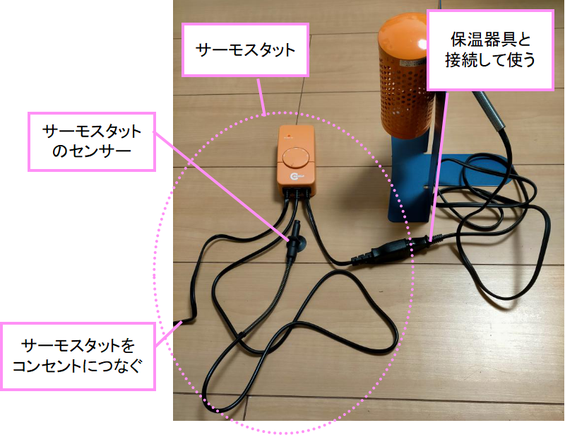 保温電球とサーモスタットの接続方法はこちらを参考にしてください。